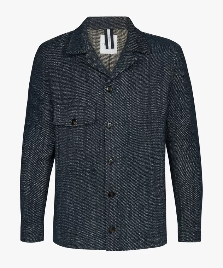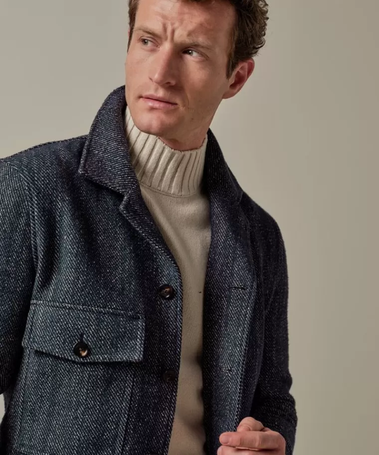 Het overshirt is de perfecte mix van een jasje en een overhemd en is een goed item voor een gelaagde look. Draag het over een t-shirt of trui. Dit navy overshirt is perfect voor een mooie casual look in de winter. Gemaakt van een Italiaanse stof en heeft een mooie oversized opgestikte zak en echte hoornen knopen.