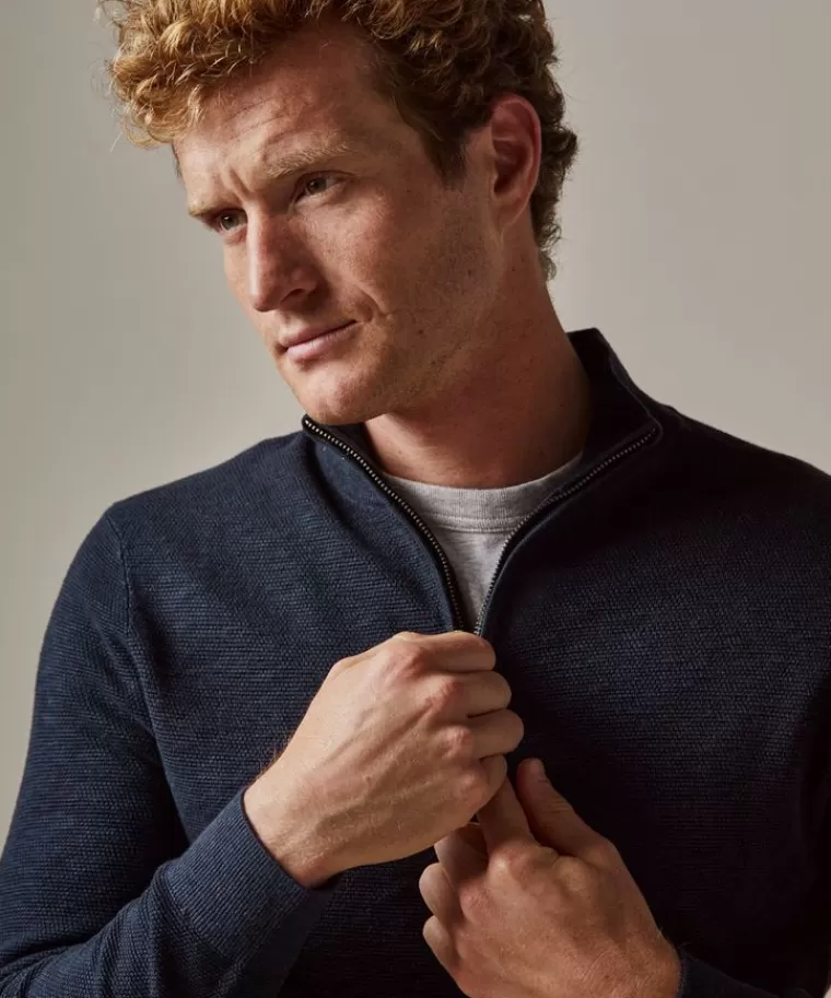 Een mooie basic. Deze navy half zip trui heeft een mooie structuur en mélange effect. Biologisch 100% katoen.