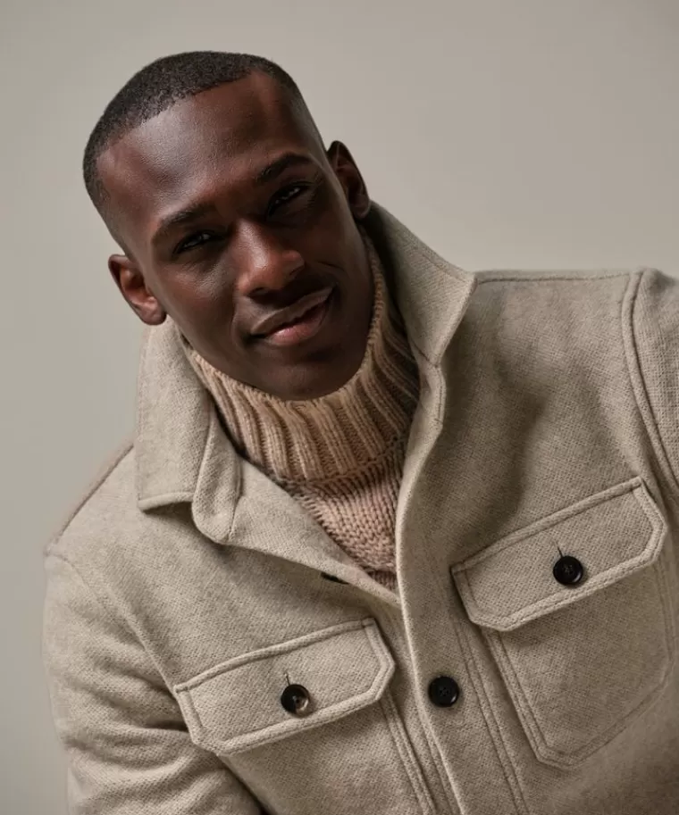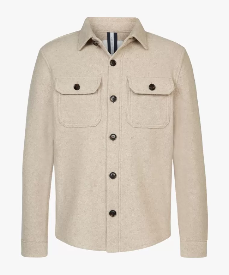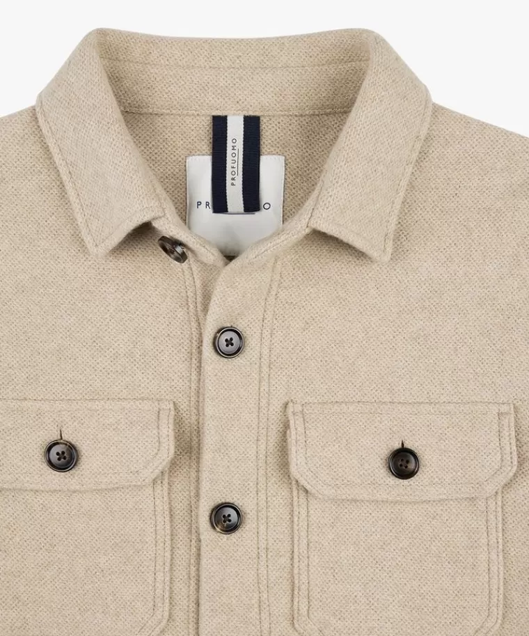 Het overshirt is de perfecte mix van een jasje en een overhemd en is een goed item voor een gelaagde look. Draag het over een t-shirt of trui. Dit beige knitted overshirt is perfect voor comfort in de winter en door de wol-blend ook warm. Gemaakt van een Italiaanse stof, 2 opgestikte zakken en echte hoornen knopen.